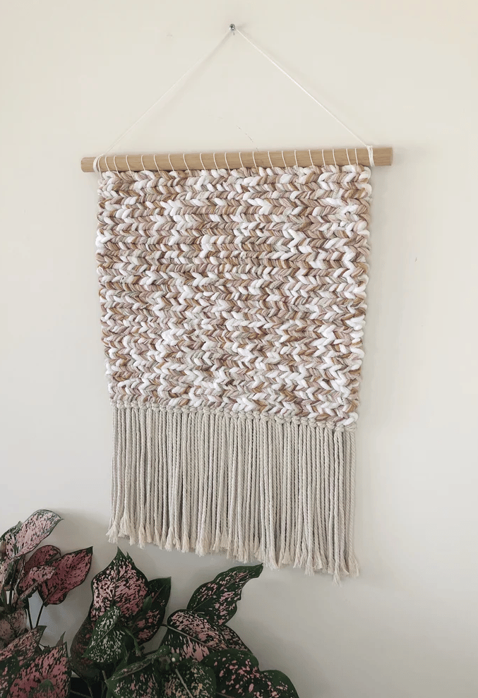 This boho style wall hanging is made from soft cotton yarns in neutral tones. This piece is soft, chunky and perfect for adding a cozy, boho vibe to any space.